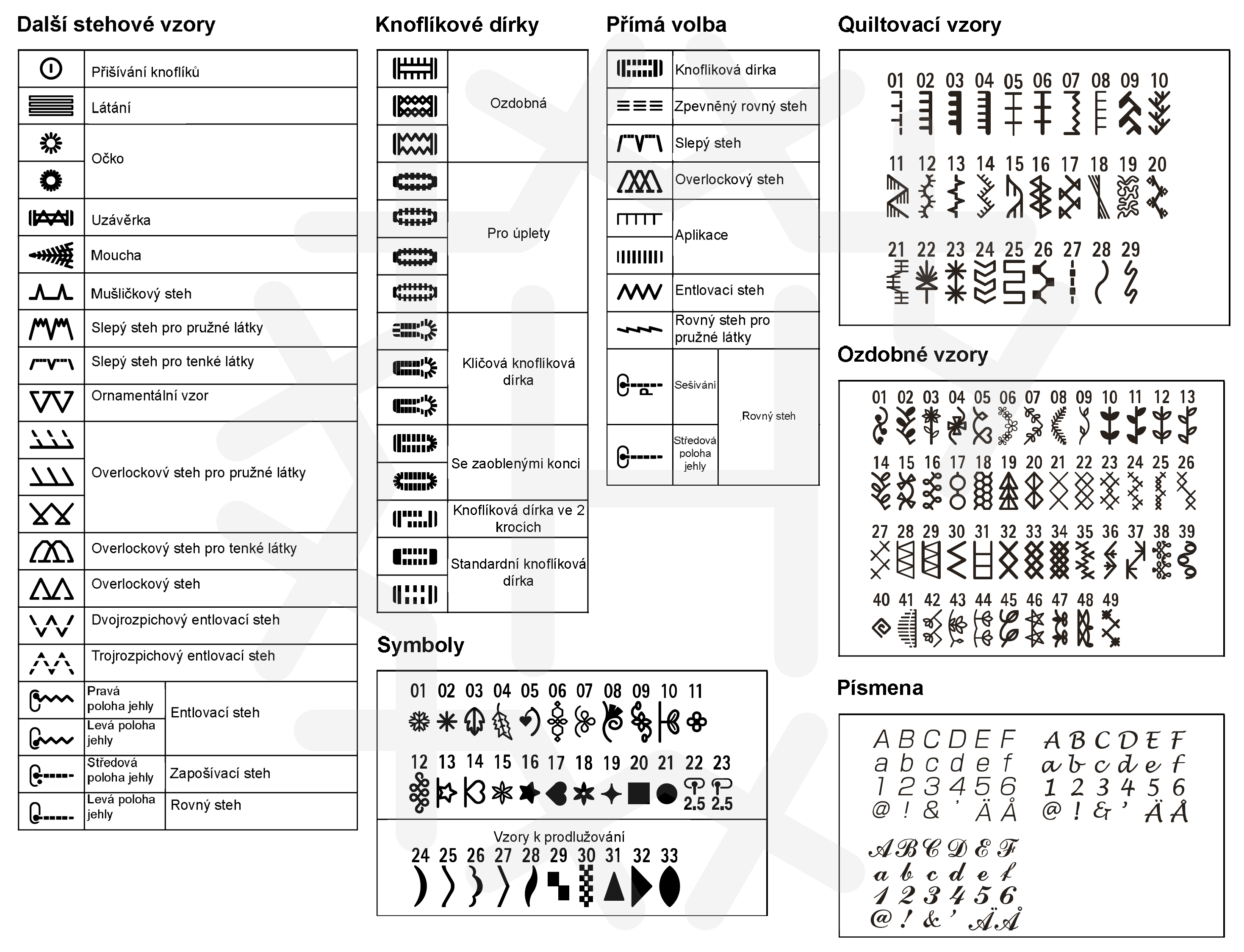 Rychlou volbu programů zaručují tlačítka klávesnice Přímé volby pro nejčastěji používané šicí programy, podobně tak je velmi jednoduché volit písmena, číslice nebo znaky, protože máte možnost zadávat písmena na displej podobně jak na mobilním telefonu.
