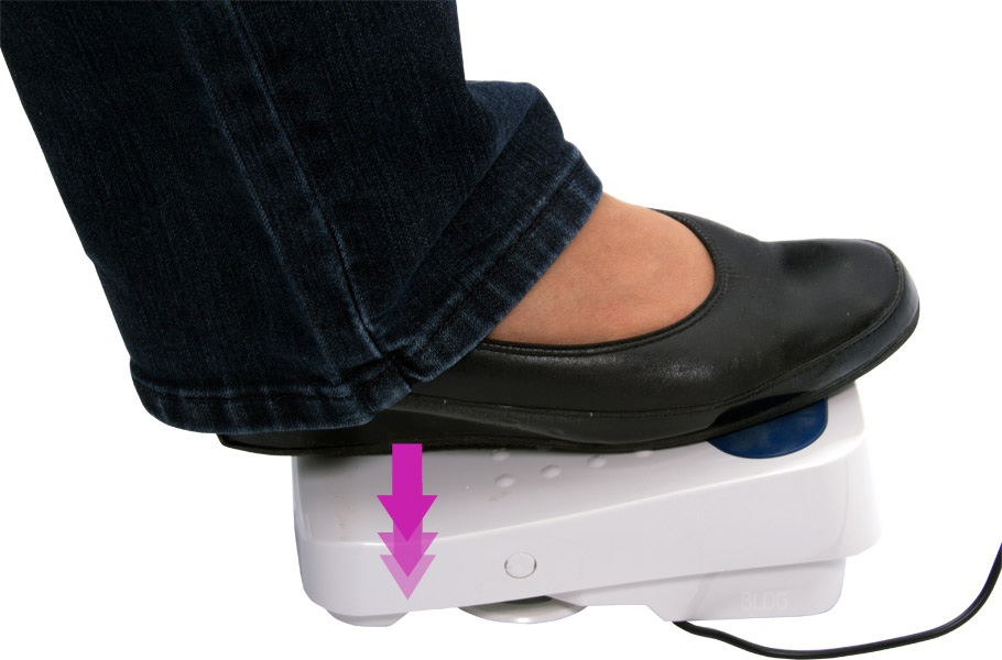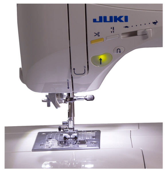 - exkluzivním nožním ovládačem JUKI s funkcí odstřihu. Stiskněte nohou tlačítko BACK umístěné pod horní plochou nožního spouštěče, v místě kde máte patu. Je to velmi jednoduché, komfortní a návykové.