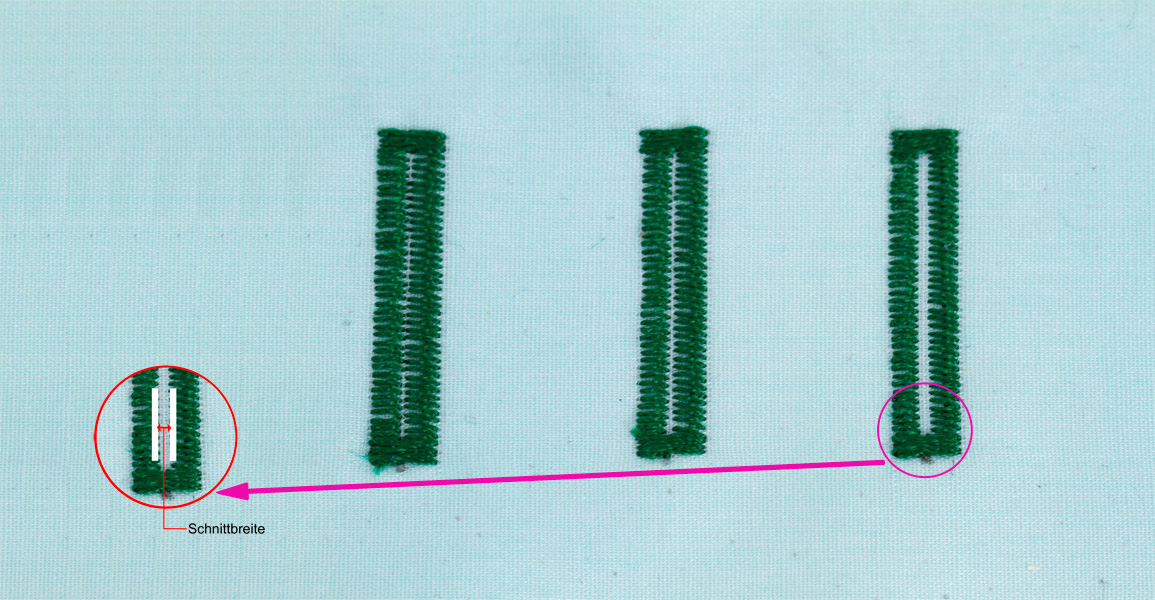 Nyní je možné nastavit vnitřní šířku knoflíkové dírky pro prostřížení vnitřní části knoflíkové dírky ve třech krocích tak, aniž by vnější šířka dírky byla současně zmenšena nebo zvětšena. To vám umožní používat tenké nebo silné knoflíky a dosáhnout na tenkých i silných materiálech vždy stabilní vyušití knoflíkové dírky.