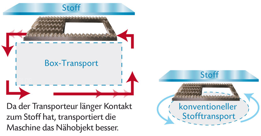 Podávací zoubky jsou vyrobeny ze speciální oceli, s jedinečným tvarováním a mají 7 podávacích ploch. Díky tomuto speciálnímu podavači se sedmi podávajícími částmi s jistotou vedete látku pod šicí patkou a to od tenkých látek až po džínovinu. Z toho dva samostatné podavače jsou umístěny před místem vpichu jehly a umožňují snadné zahájení šití.