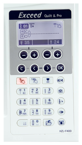 Jen jednou zmáčknete a máte vybrán vzor. Jedním stiskem tlačítka na klávesnici můžete přímo vybrat z 10 nejběžnějších šicích programů včetně aplikačních stehů, které jsou zde také zahrnuty. Klávesnice je postavena na principu klávesnice z mobilního telefonu, která vám umožňuje rychlý výběr písmen. Velmi dobře čitelný a kontrastní LCD displej zobrazuje zvolené nastavení stehu, zobrazení šitého programu a dokonce i doporučuje správnou přítlačnou patku daný steh. Změna nastavení je ihned patrná na displeji stroje.