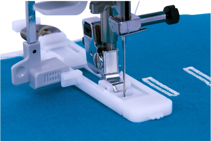 Stiskněte tlačítko na přítlačné patce a uveďte patku vodorovně se stehovou deskou. To umožňuje snadné šití s více vrstvami látky nebo překrývajících se materiálů a těžkých tkanin.